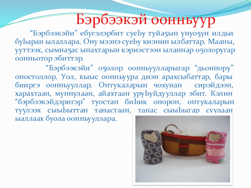 “Бэрбээкэйи” ебугэлэрбит суеЬу туйа5ын унуо5ун илдьи буЬаран ылаллара. Ону мээнэ суеЬу киэнин ылбаттар. Мааны, ууттээх, сымна5ас ынахтарын кэриэстээн ыланнар о5олоругар оонньотор эбиттэр.