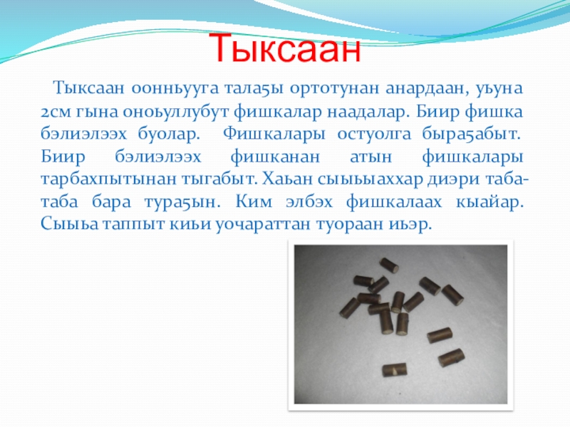 Тыксаан оонньууга тала5ы ортотунан анардаан, уьуна 2см гына оноьуллубут фишкалар