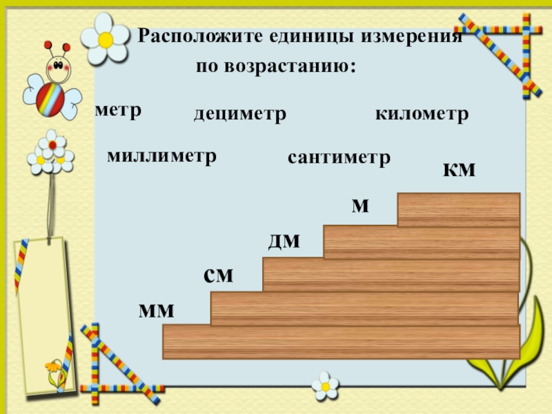 Расположите единицы измерения по возрастанию:дециметркилометрметрсантиметрмиллиметрммсмдммкм