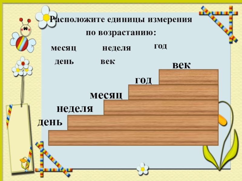 Расположите единицы измерения по возрастанию:месяцнеделягодденьвекденьгодвекмесяцнеделя