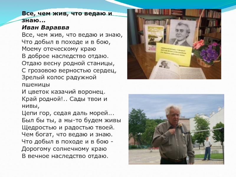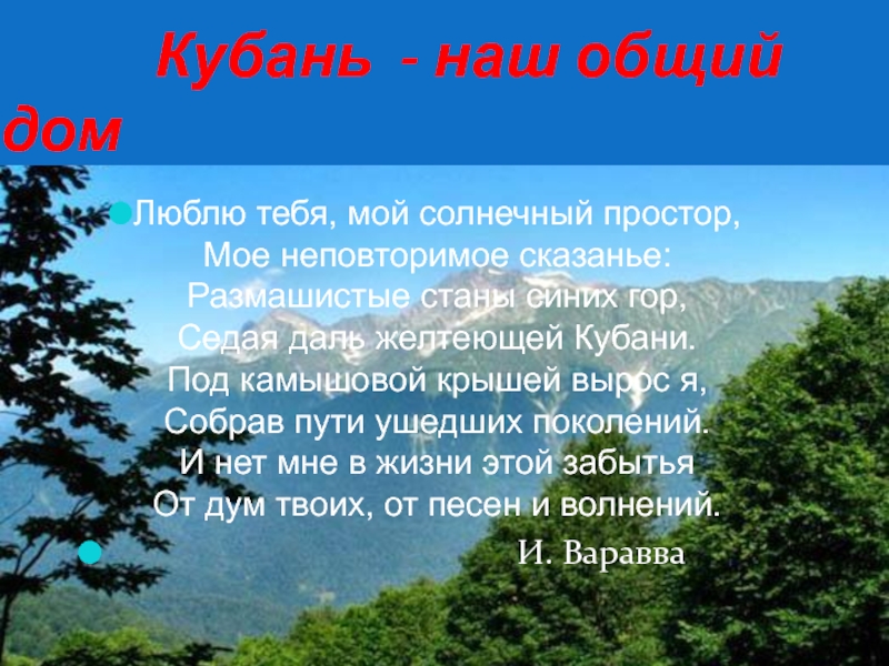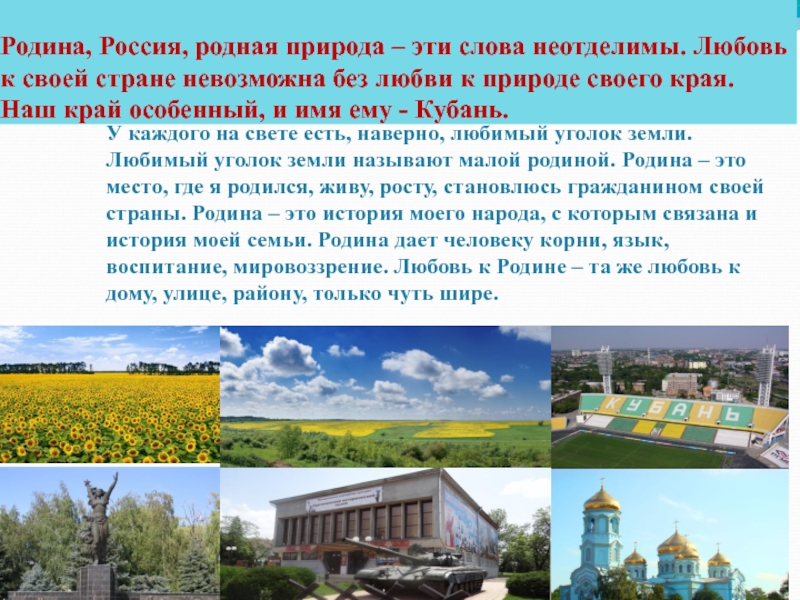 У каждого на свете есть, наверно, любимый уголок земли. Любимый уголок земли называют малой родиной. Родина – это место, где я родился, живу, росту, становлюсь гражданином своей страны. Родина – это история моего народа, с которым связана и история моей семьи. Родина дает человеку корни, язык, воспитание, мировоззрение. Любовь к Родине – та же любовь к дому, улице, району, только чуть шире.