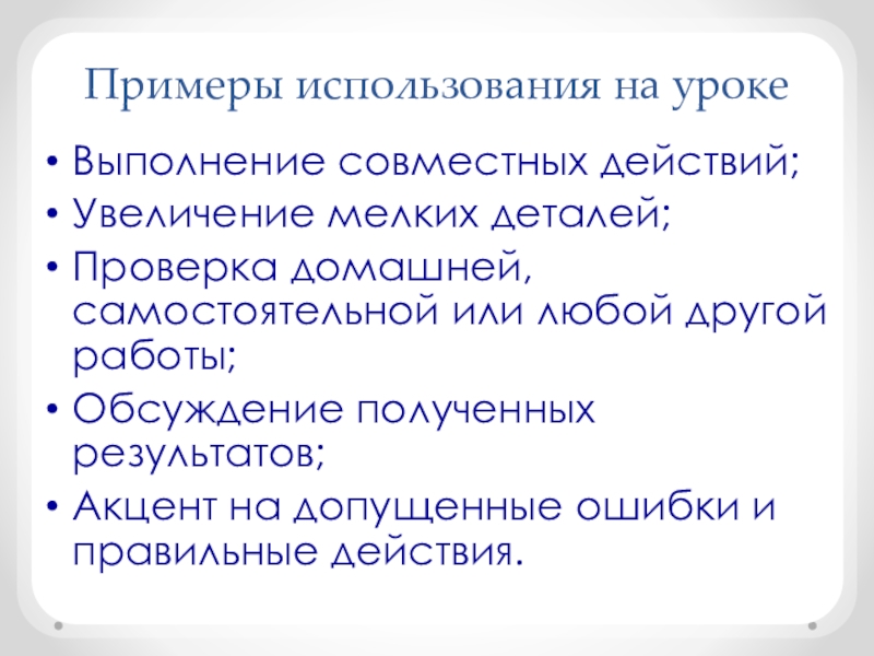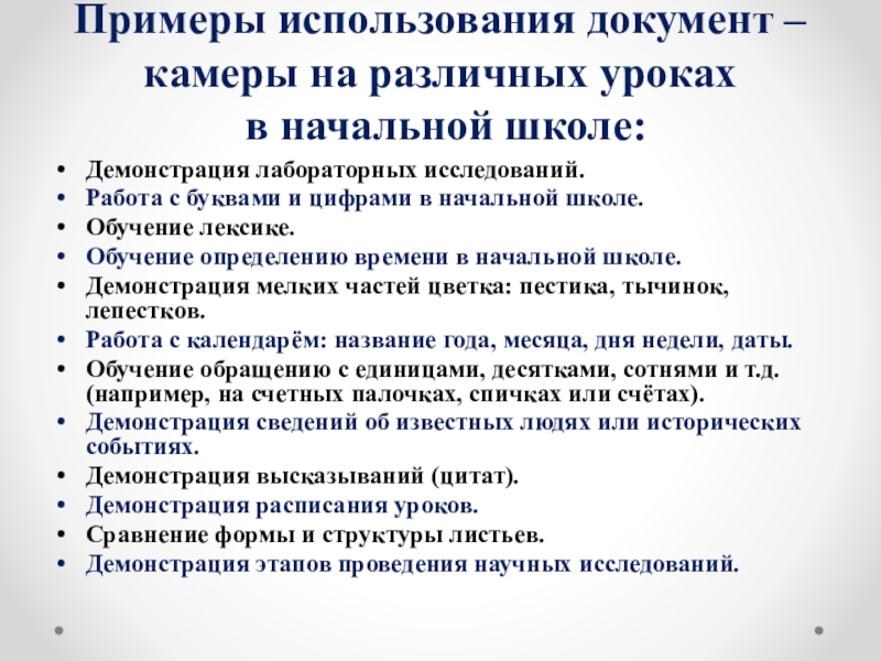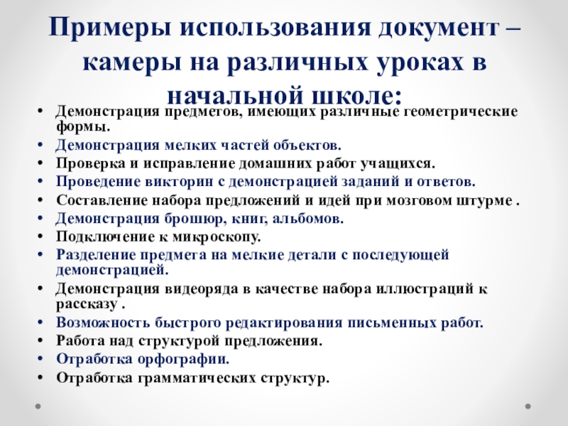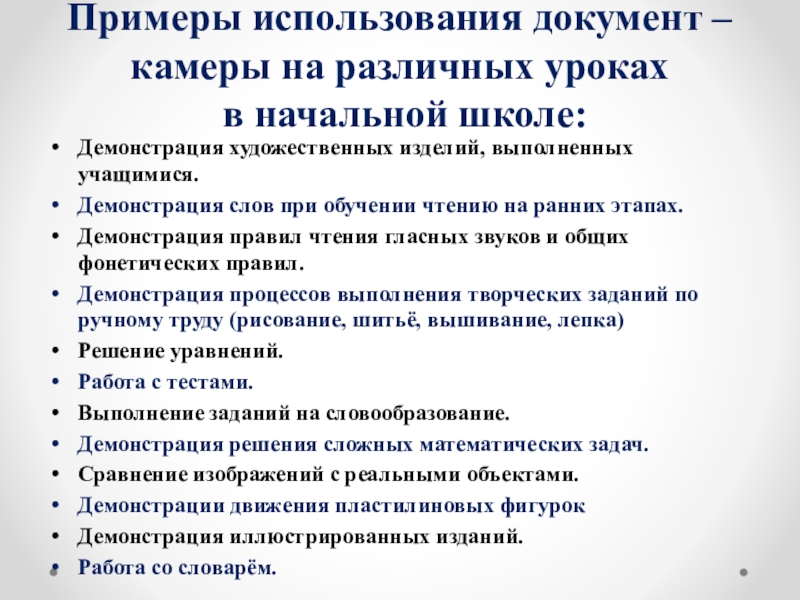 Слайд 17Примеры использования документ – камеры на различных уроках в начальной школе: