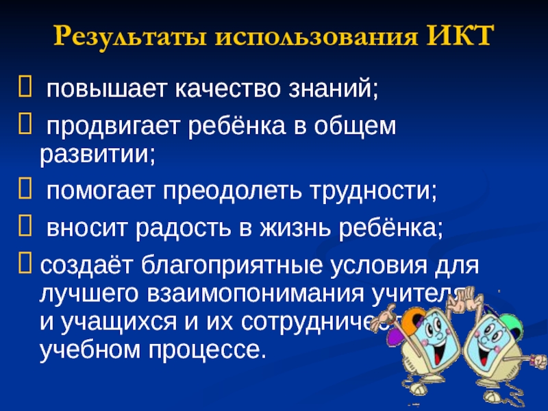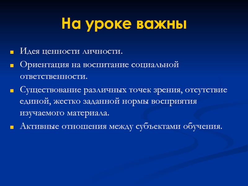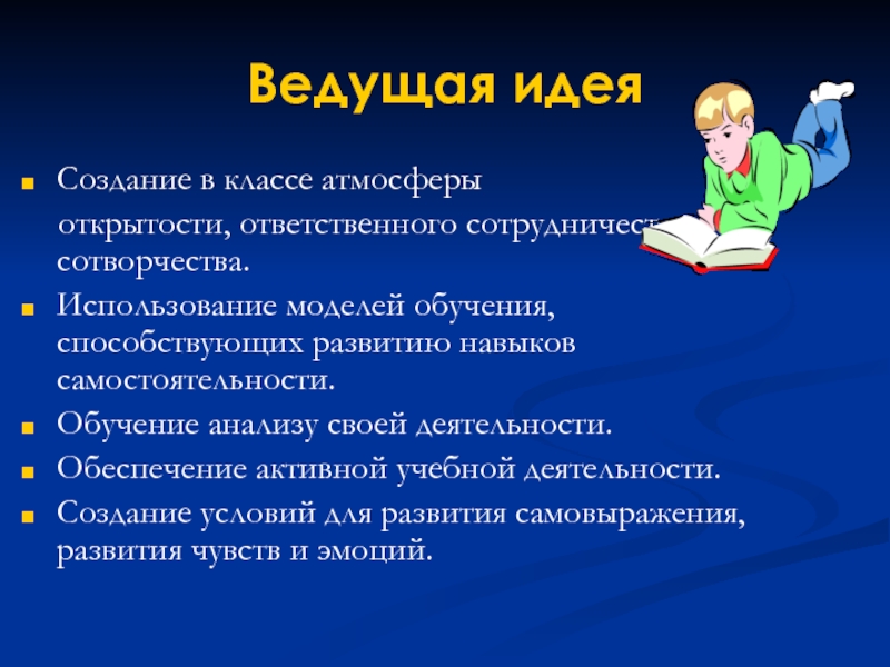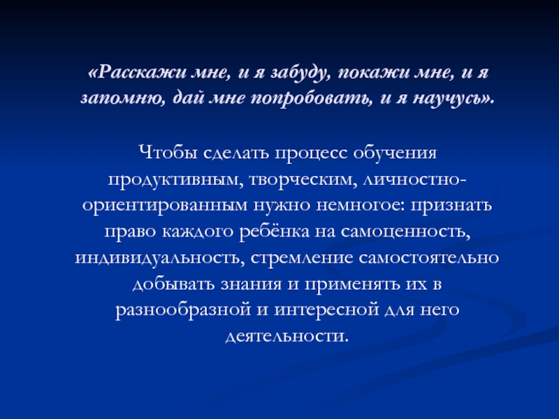 Чтобы сделать процесс обучения продуктивным, творческим, личностно-ориентированным нужно немногое: признать право каждого ребёнка на самоценность, индивидуальность, стремление самостоятельно добывать знания и применять их в разнообразной и интересной для него деятельности.