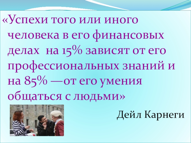 «Успехи того или иного человека в его финансовых делах на 15% зависят от его профессиональных знаний и на 85% —от его умения общаться с людьми»