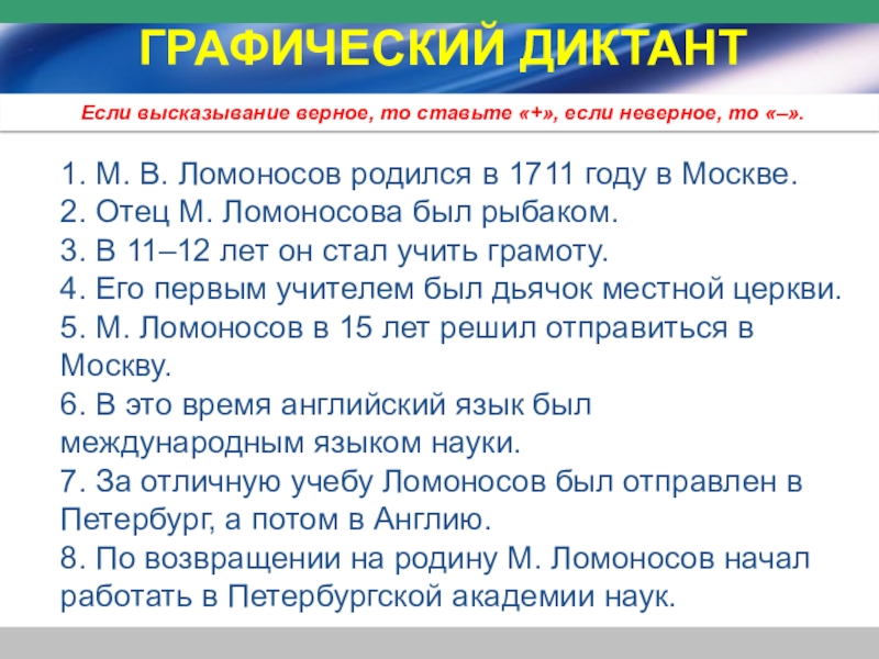 1. М. В. Ломоносов родился в 1711 году в Москве.