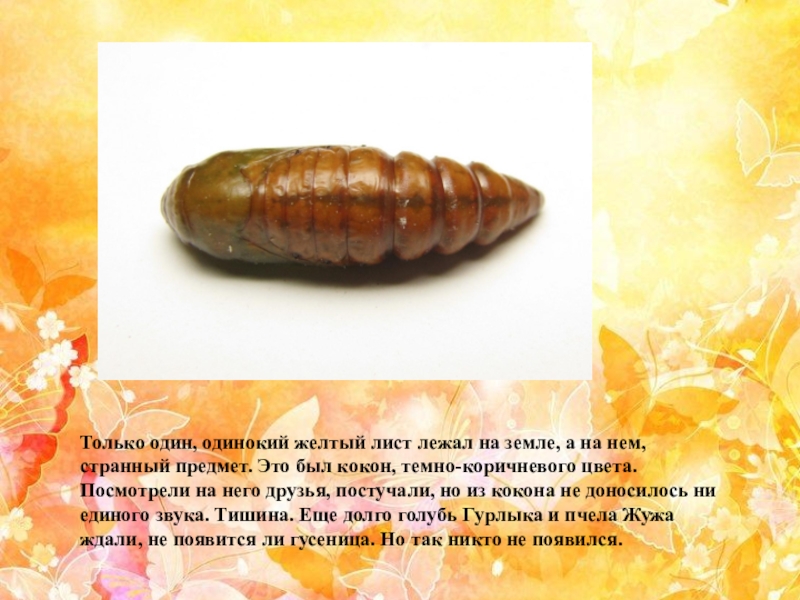 странный предмет. Это был кокон, темно-коричневого цвета. Посмотрели на него друзья, постучали, но из кокона не доносилось ни единого звука. Тишина. Еще долго голубь Гурлыка и пчела Жужа ждали, не появится ли гусеница. Но так никто не появился.