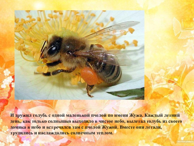 Слайд 3И дружил голубь с одной маленькой пчелой по имени Жужа. Каждый