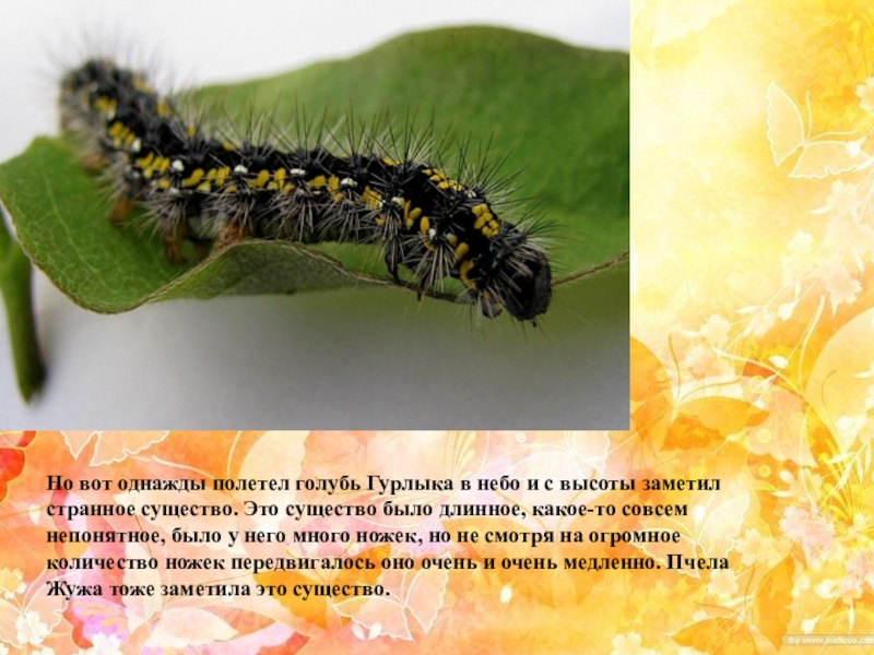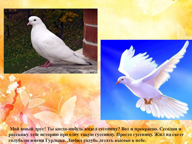 Сегодня я расскажу тебе историю про одну такую гусеницу. Просто гусеницу. Жил на свете голубь по имени Гурлыка. Любил голубь летать высоко в небе.