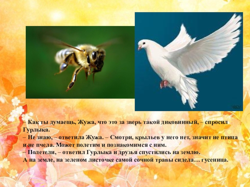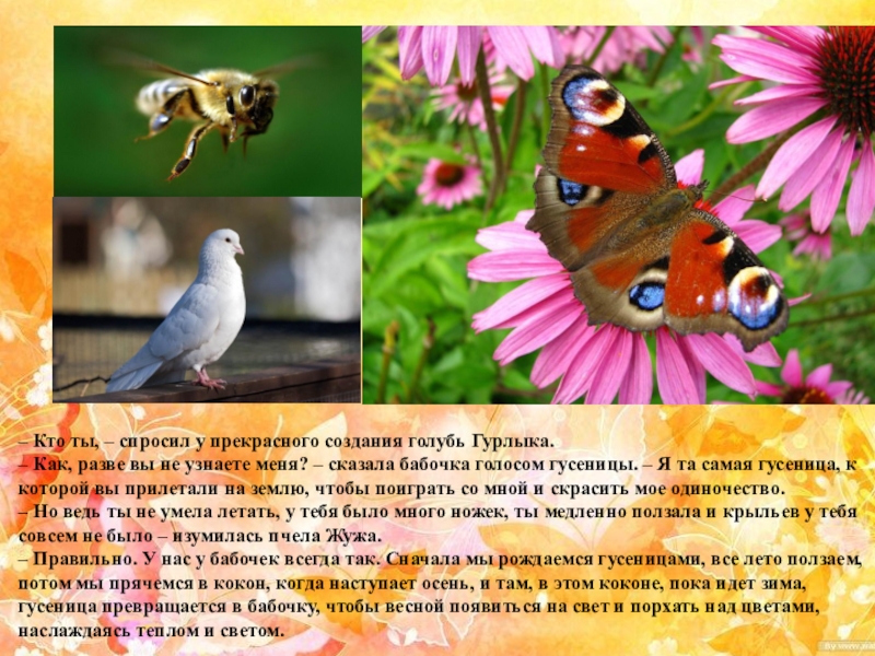 голубь Гурлыка, и пчела Жужа, и бабочка, которая раньше была совсем обыкновенной гусеницей.