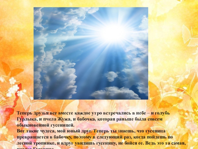 Вот такие чудеса, мой юный друг. Теперь ты знаешь, что гусеница превращается в бабочку, поэтому в следующий раз, когда пойдешь по лесной тропинке, и вдруг увидишь гусеницу, не бойся ее. Ведь это та самая, просто Гусеница.