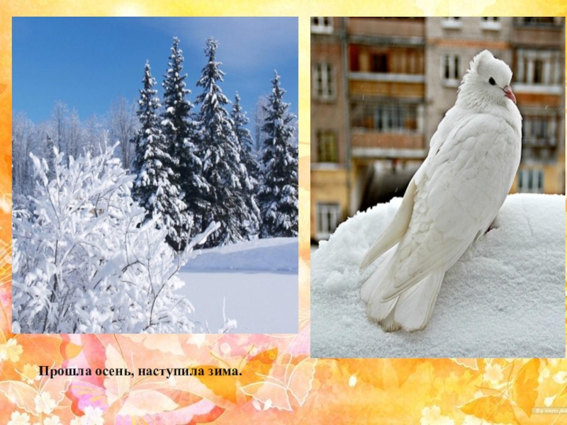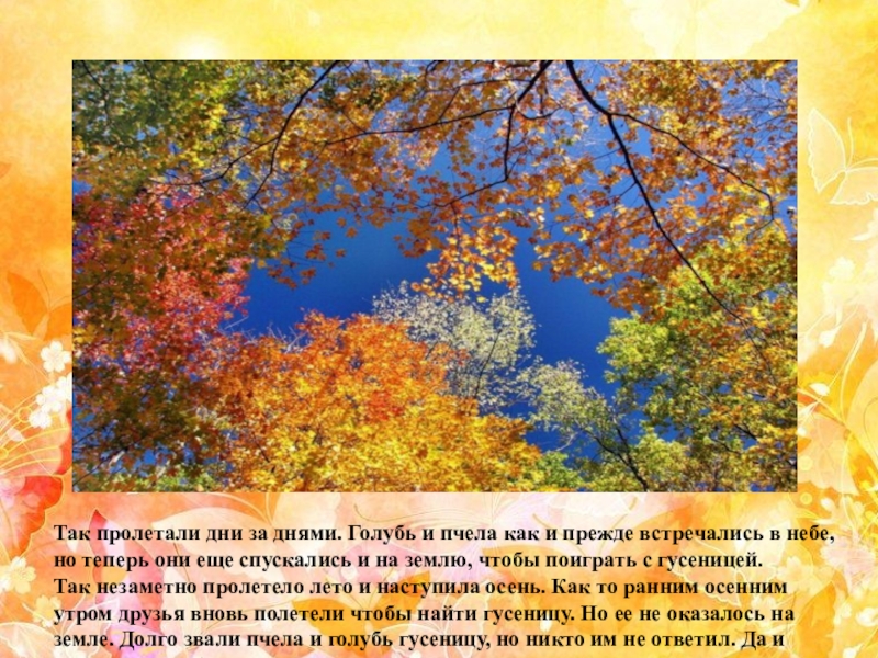 Так незаметно пролетело лето и наступила осень. Как то ранним осенним утром друзья вновь полетели чтобы найти гусеницу. Но ее не оказалось на земле. Долго звали пчела и голубь гусеницу, но никто им не ответил. Да и травы уже не было.