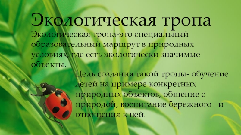 Экологическая тропа-это специальный образовательный маршрут в природных условиях, где есть экологически значимые объекты.