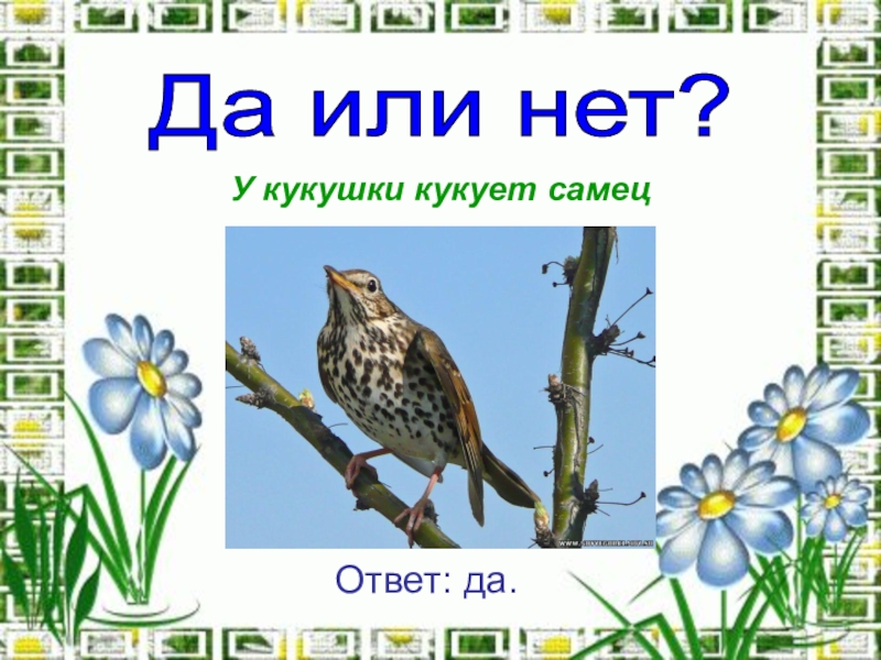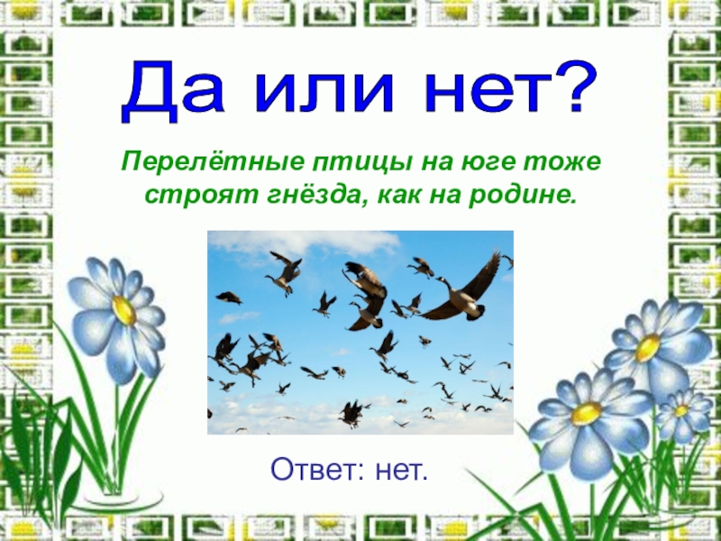 Да или нет?Перелётные птицы на юге тоже строят гнёзда, как на родине. Ответ: нет.