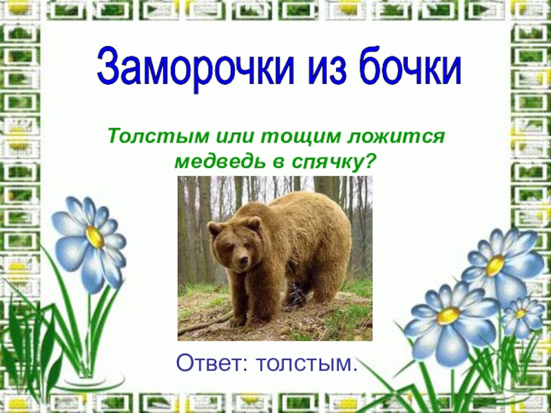 Заморочки из бочкиТолстым или тощим ложится медведь в спячку?Ответ: толстым.