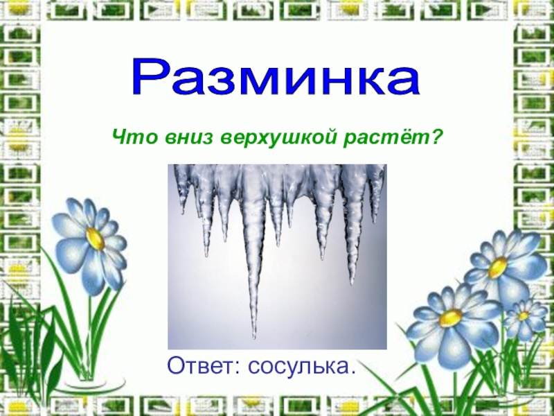 Разминка Что вниз верхушкой растёт?Ответ: сосулька.