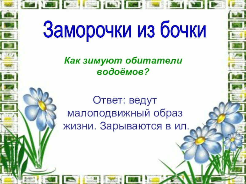 Заморочки из бочкиКак зимуют обитатели водоёмов?Ответ: ведут малоподвижный образ жизни. Зарываются в ил.
