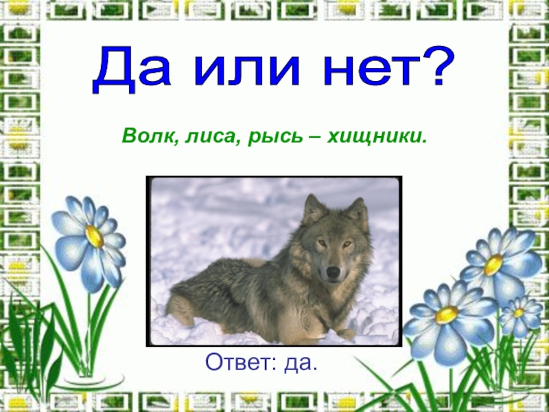 Да или нет?Волк, лиса, рысь – хищники.Ответ: да.