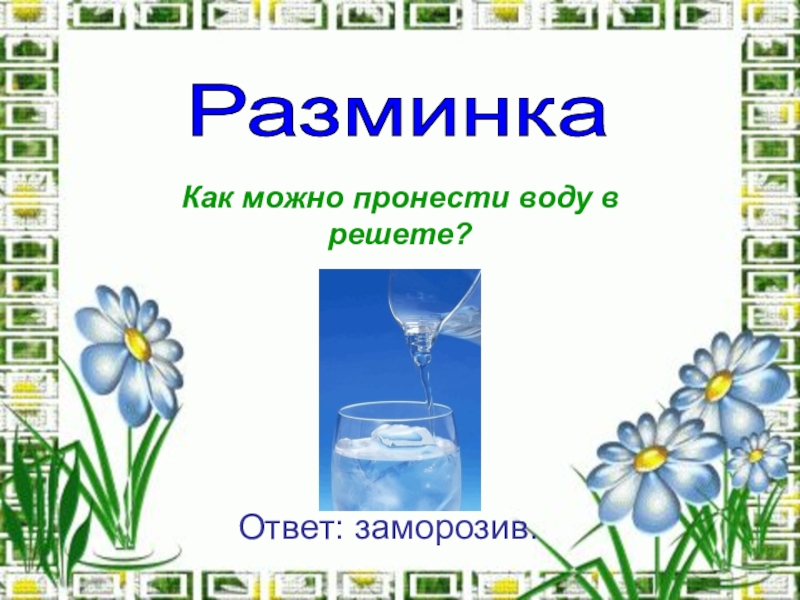 Разминка Как можно пронести воду в решете?Ответ: заморозив.