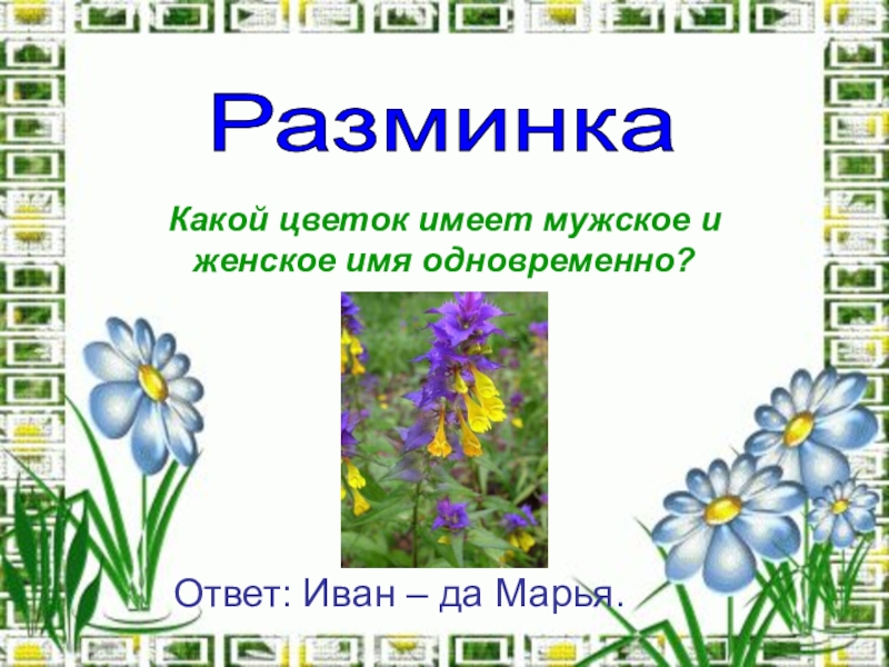 Разминка Какой цветок имеет мужское и женское имя одновременно?Ответ: Иван – да Марья.
