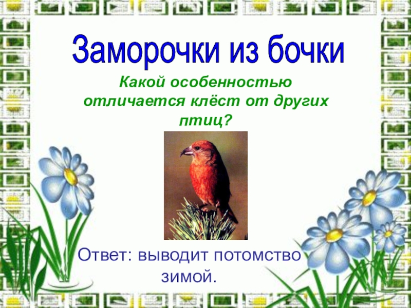 Заморочки из бочкиКакой особенностью отличается клёст от других птиц?Ответ: выводит потомство зимой.