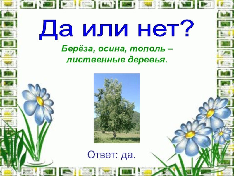 Да или нет?Берёза, осина, тополь – лиственные деревья.Ответ: да.