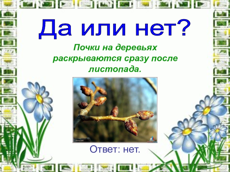 Да или нет?Почки на деревьях раскрываются сразу после листопада.Ответ: нет.