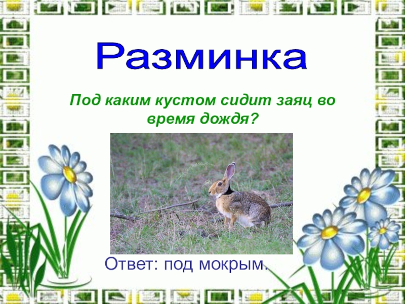 Разминка Под каким кустом сидит заяц во время дождя?Ответ: под мокрым.