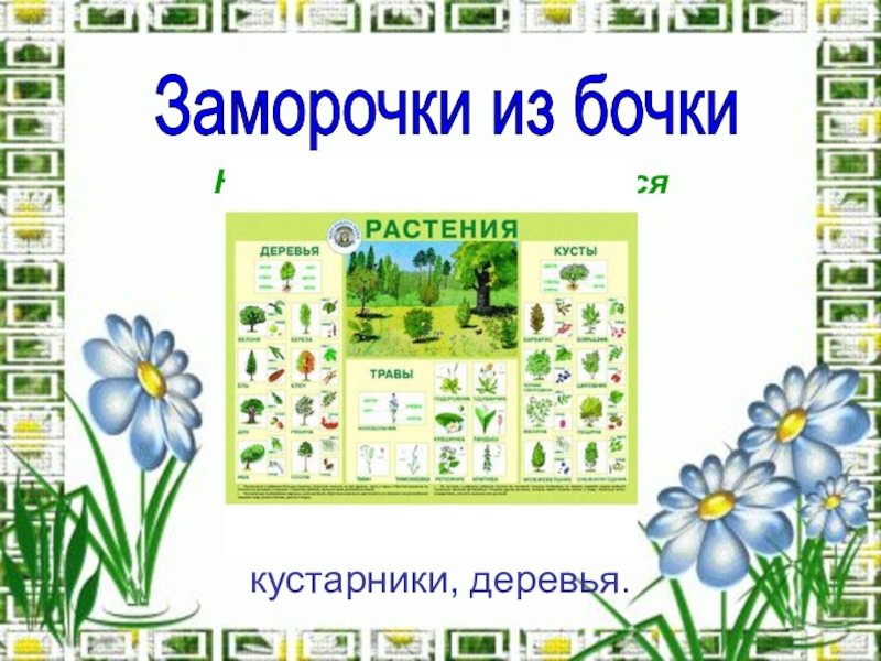 Заморочки из бочкиНа какие группы делятся растения?Ответ: травы, кустарники, деревья.