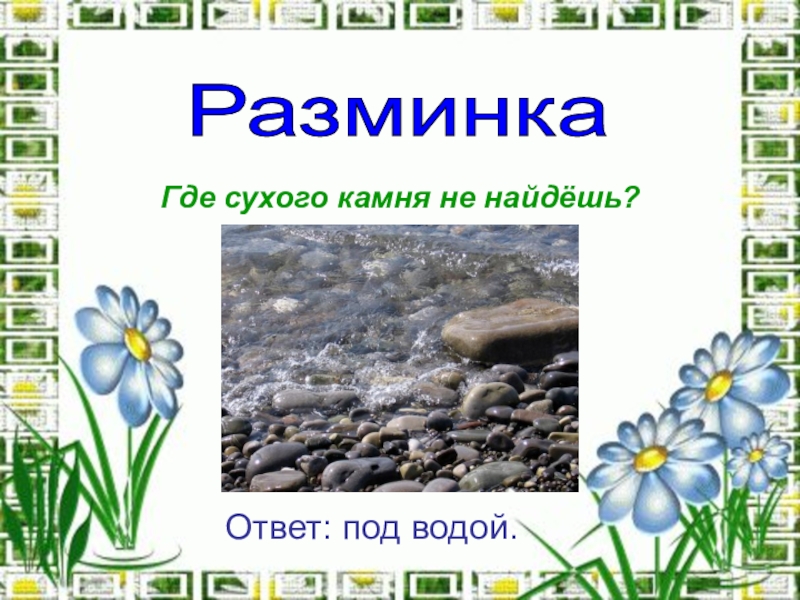 Разминка Где сухого камня не найдёшь?Ответ: под водой.