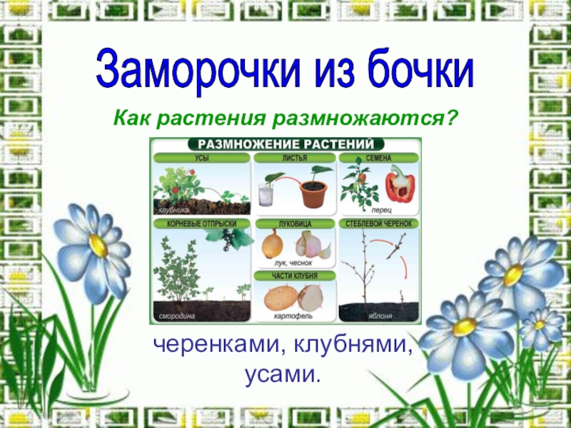 Заморочки из бочкиКак растения размножаются?Ответ: семенами, черенками, клубнями, усами.