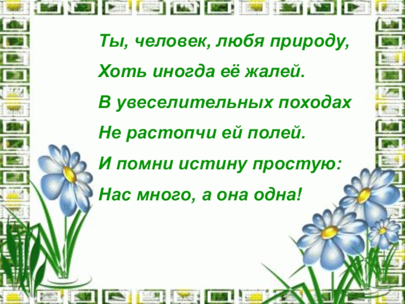 Ты, человек, любя природу,Хоть иногда её жалей.В увеселительных походахНе растопчи ей полей. И помни истину простую:Нас много,