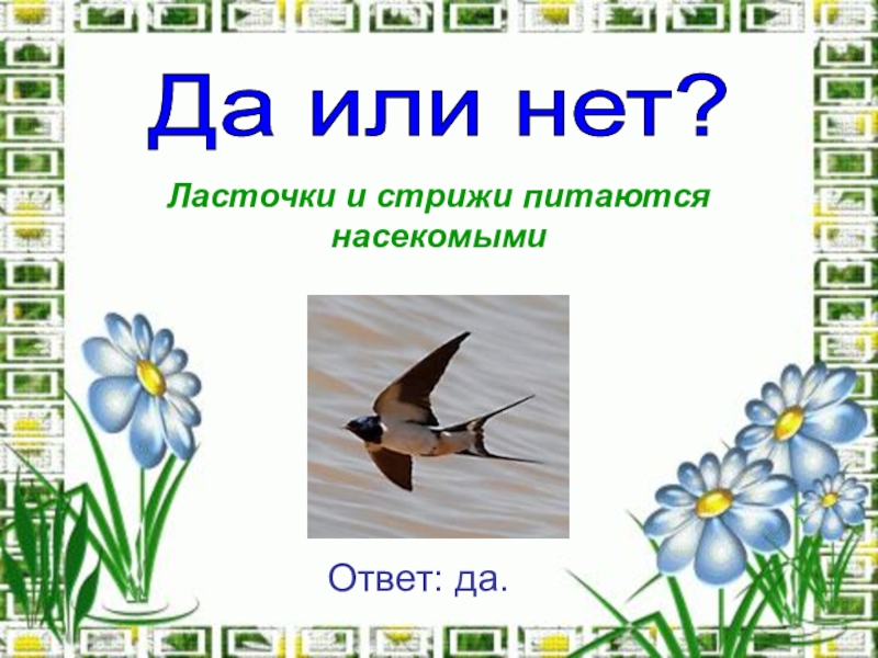 Да или нет?Ласточки и стрижи питаются насекомымиОтвет: да.