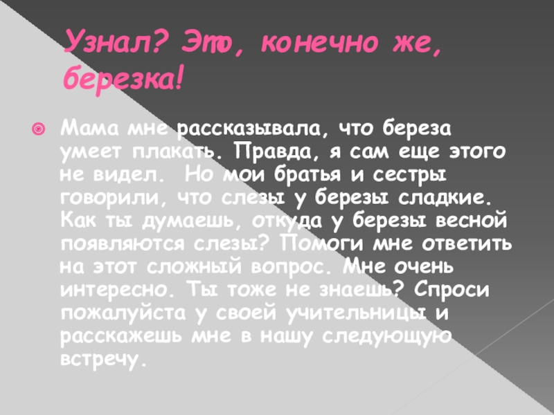 Правда, я сам еще этого не видел. Но мои братья и сестры говорили, что слезы у березы сладкие. Как ты думаешь, откуда у березы весной появляются слезы? Помоги мне ответить на этот сложный вопрос. Мне очень интересно. Ты тоже не знаешь? Спроси пожалуйста у своей учительницы и расскажешь мне в нашу следующую встречу.