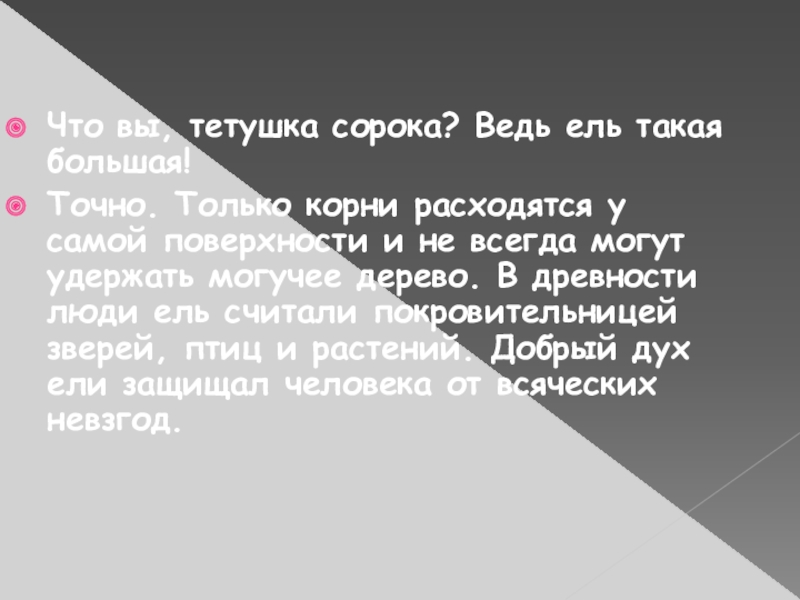 Слайд 10Что вы, тетушка сорока? Ведь ель такая большая!