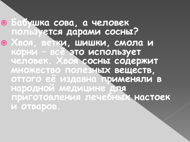 Слайд 17Бабушка сова, а человек пользуется дарами сосны?
