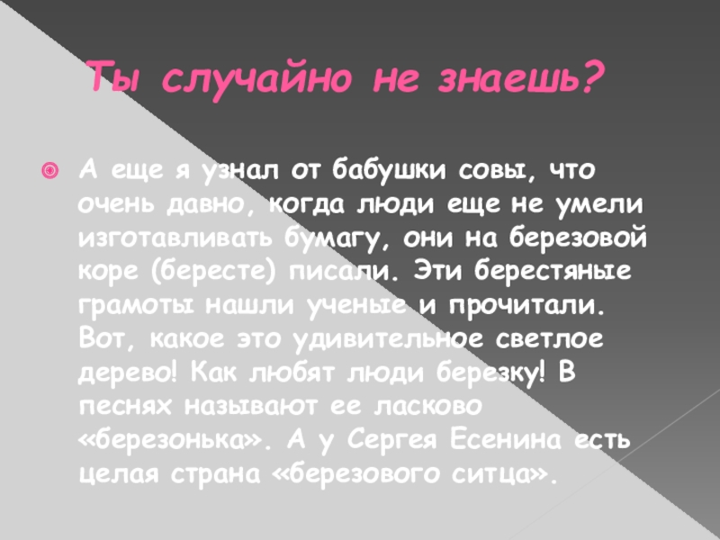 что очень давно, когда люди еще не умели изготавливать бумагу, они на березовой коре (бересте) писали. Эти берестяные грамоты нашли ученые и прочитали. Вот, какое это удивительное светлое дерево! Как любят люди березку! В песнях называют ее ласково «березонька». А у Сергея Есенина есть целая страна «березового ситца».