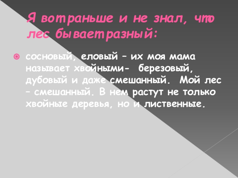 Слайд 5Я вот раньше и не знал, что лес бывает разный: