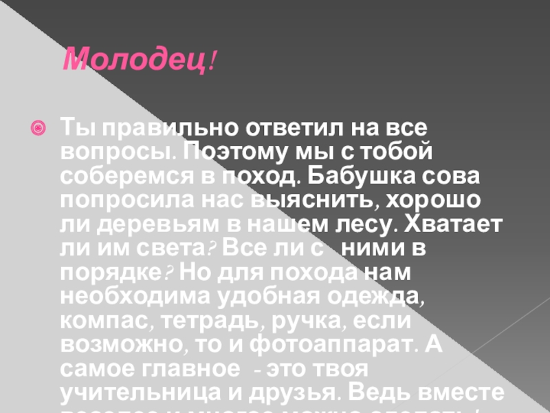 соберемся в поход. Бабушка сова попросила нас выяснить, хорошо ли деревьям в нашем лесу. Хватает ли им света? Все ли с ними в порядке? Но для похода нам необходима удобная одежда, компас, тетрадь, ручка, если возможно, то и фотоаппарат. А самое главное - это твоя учительница и друзья. Ведь вместе веселее и многое можно сделать! Согласен?