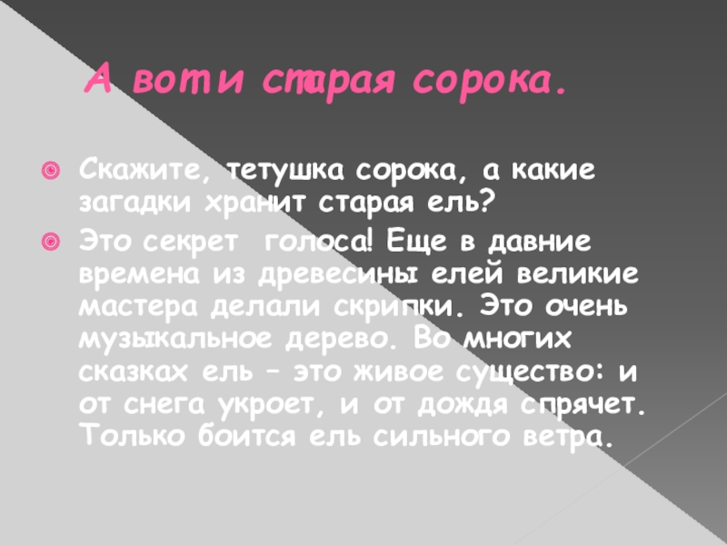 Это секрет голоса! Еще в давние времена из древесины елей великие мастера делали скрипки. Это очень музыкальное дерево. Во многих сказках ель – это живое существо: и от снега укроет, и от дождя спрячет. Только боится ель сильного ветра.