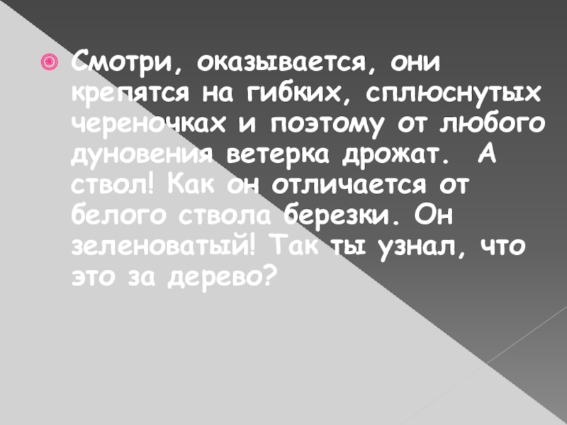 любого дуновения ветерка дрожат. А ствол! Как он отличается от белого ствола березки. Он зеленоватый! Так ты узнал, что это за дерево?