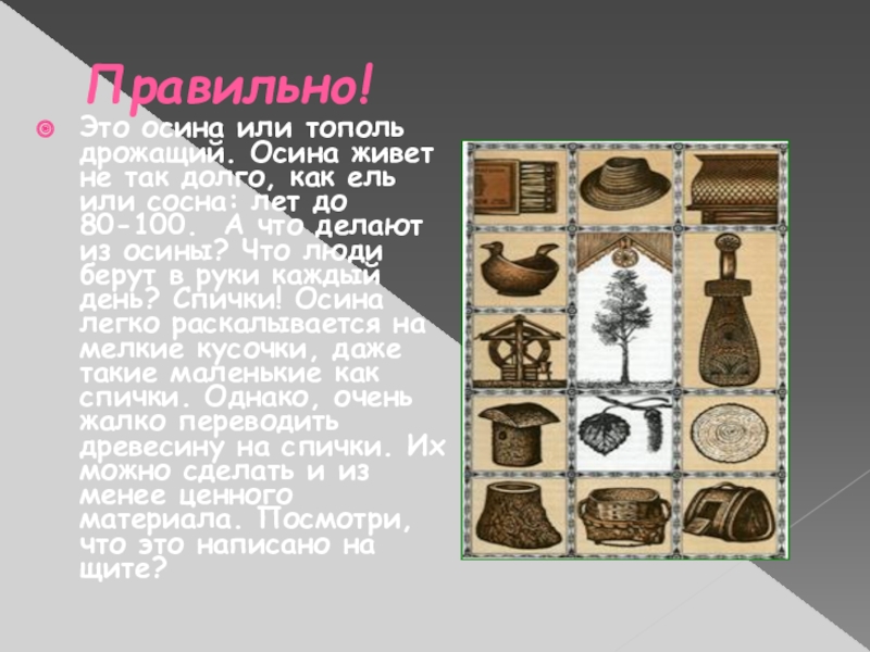 как ель или сосна: лет до 80-100. А что делают из осины? Что люди берут в руки каждый день? Спички! Осина легко раскалывается на мелкие кусочки, даже такие маленькие как спички. Однако, очень жалко переводить древесину на спички. Их можно сделать и из менее ценного материала. Посмотри, что это написано на щите?