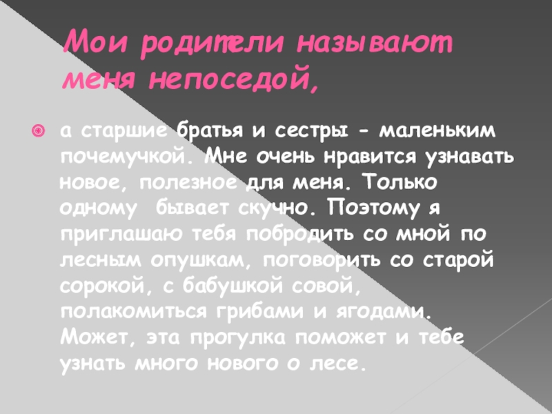 почемучкой. Мне очень нравится узнавать новое, полезное для меня. Только одному бывает скучно. Поэтому я приглашаю тебя побродить со мной по лесным опушкам, поговорить со старой сорокой, с бабушкой совой, полакомиться грибами и ягодами. Может, эта прогулка поможет и тебе узнать много нового о лесе.