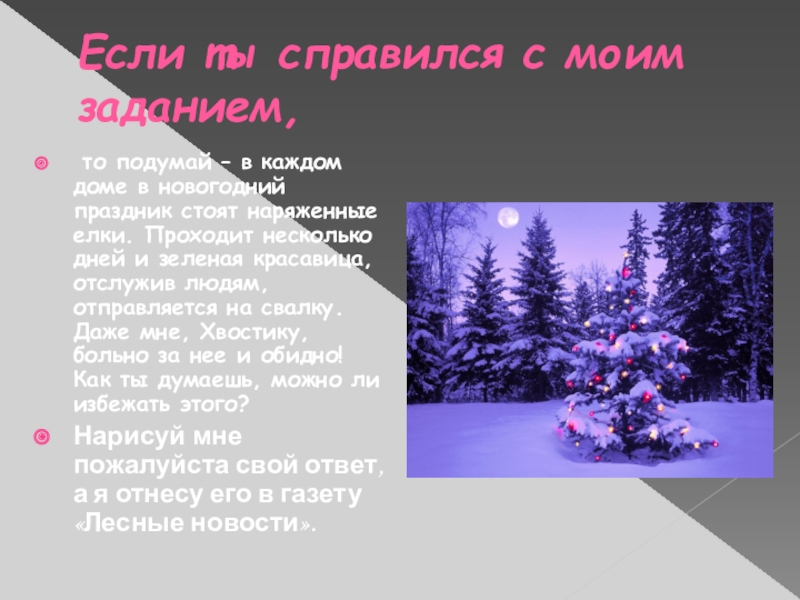 каждом доме в новогодний праздник стоят наряженные елки. Проходит несколько дней и зеленая красавица, отслужив людям, отправляется на свалку. Даже мне, Хвостику, больно за нее и обидно! Как ты думаешь, можно ли избежать этого?