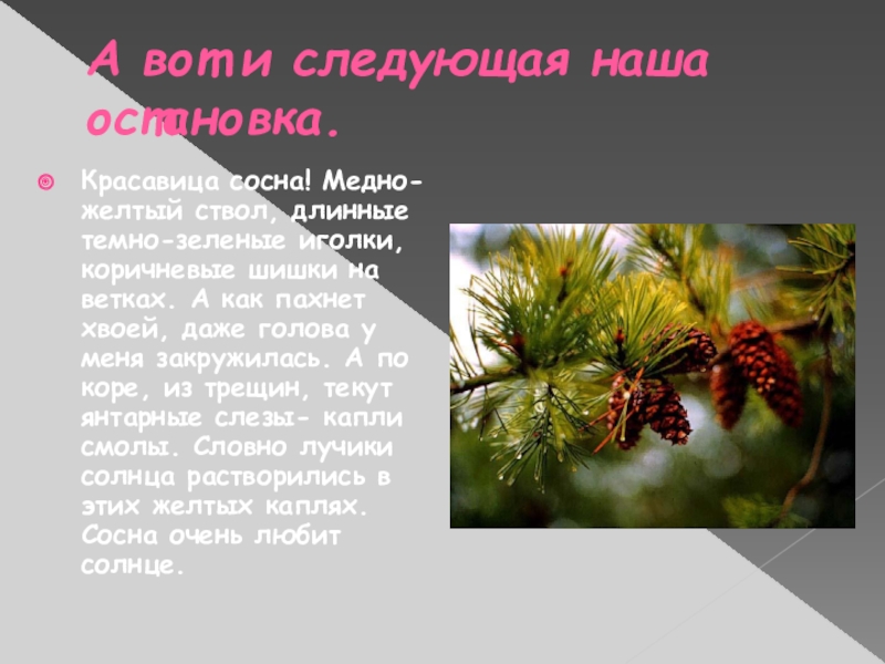 темно-зеленые иголки, коричневые шишки на ветках. А как пахнет хвоей, даже голова у меня закружилась. А по коре, из трещин, текут янтарные слезы- капли смолы. Словно лучики солнца растворились в этих желтых каплях. Сосна очень любит солнце.