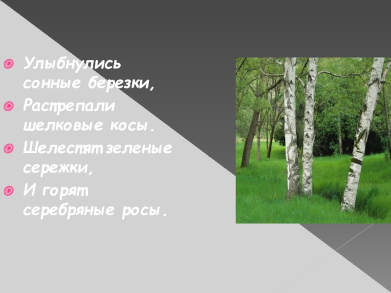 Слайд 28Улыбнулись сонные березки,
