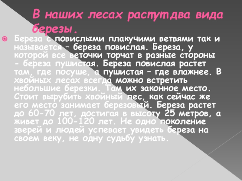 ветвями так и называется – береза повислая. Береза, у которой все веточки торчат в разные стороны - береза пушистая. Береза повислая растет там, где посуше, а пушистая – где влажнее. В хвойных лесах всегда можно встретить небольшие березки. Там их законное место. Стоит вырубить хвойный лес, как сейчас же его место занимает березовый. Береза растет до 60-70 лет, достигая в высоту 25 метров, а живет до 100-120 лет. Не одно поколение зверей и людей успевает увидеть береза на своем веку, не одну судьбу узнать.