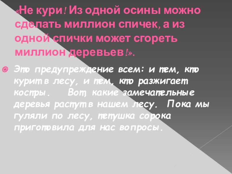 Слайд 33«Не кури! Из одной осины можно сделать миллион спичек, а из