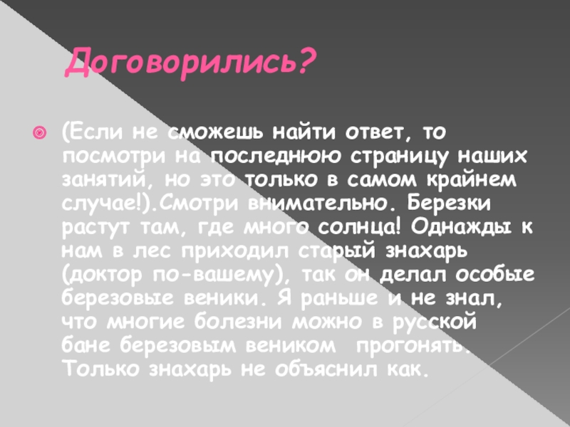 наших занятий, но это только в самом крайнем случае!).Смотри внимательно. Березки растут там, где много солнца! Однажды к нам в лес приходил старый знахарь (доктор по-вашему), так он делал особые березовые веники. Я раньше и не знал, что многие болезни можно в русской бане березовым веником прогонять. Только знахарь не объяснил как.