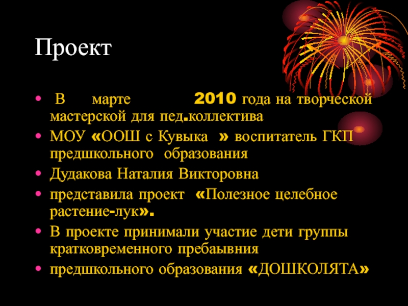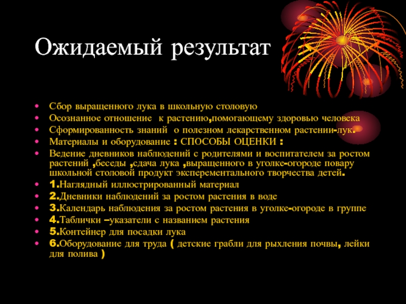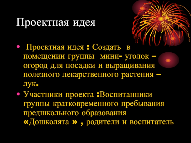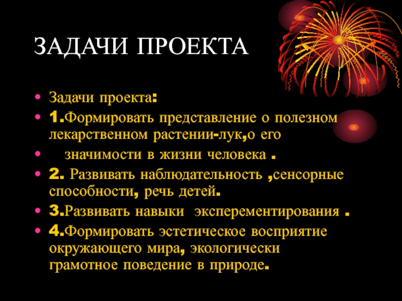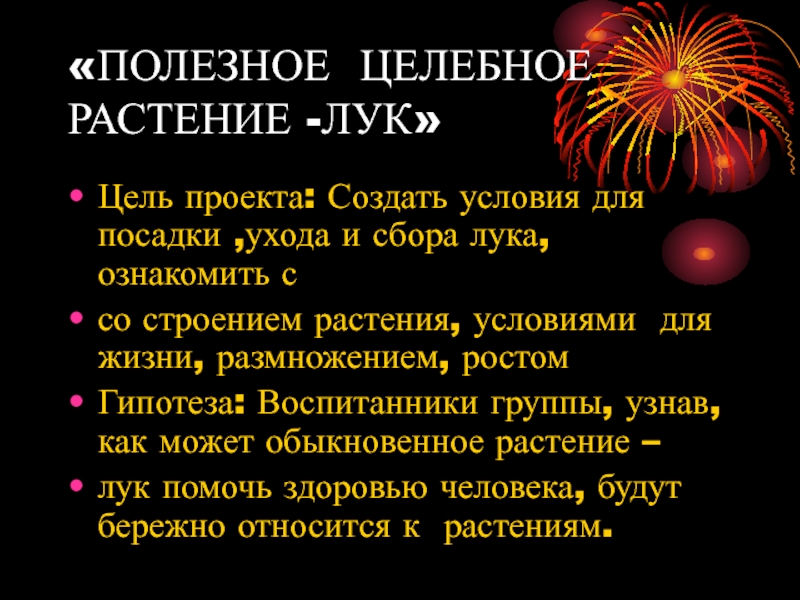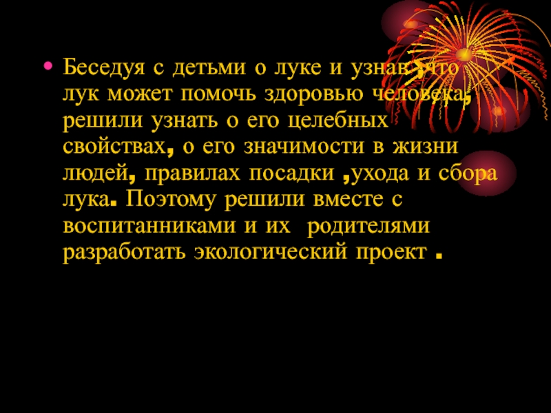 здоровью человека, решили узнать о его целебных свойствах, о его значимости в жизни людей, правилах посадки ,ухода и сбора лука. Поэтому решили вместе с воспитанниками и их родителями разработать экологический проект .