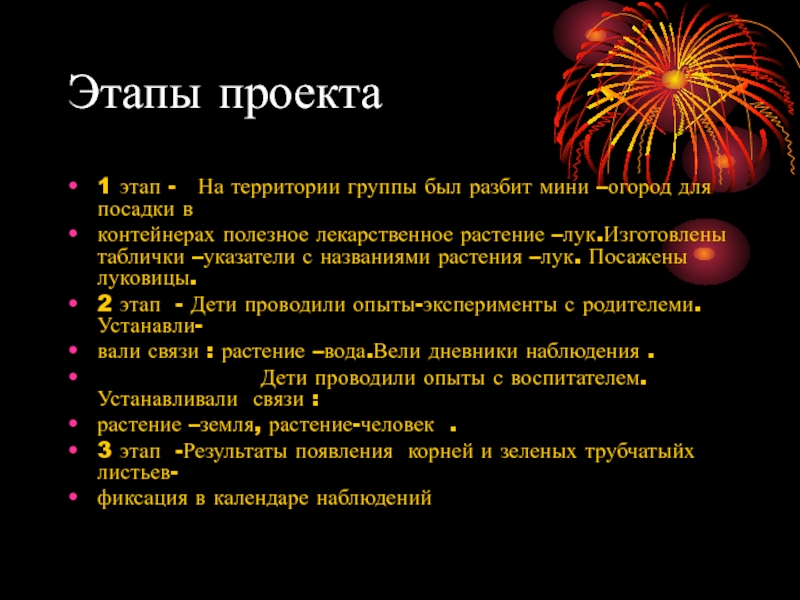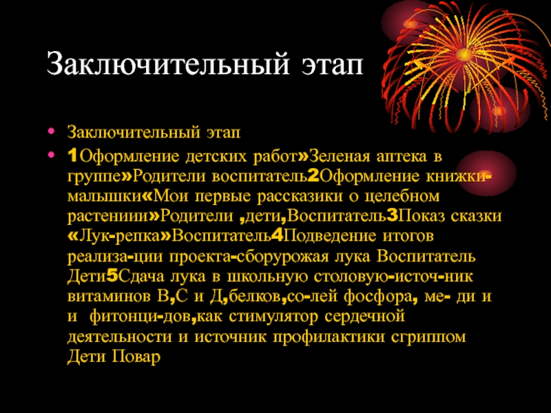 рассказики о целебном растениии»Родители ,дети,Воспитатель3Показ сказки «Лук-репка»Воспитатель4Подведение итогов реализа-ции проекта-сборурожая лука Воспитатель Дети5Сдача лука в школьную столовую-источ-ник витаминов В,С и Д,белков,со-лей фосфора, ме- ди и и фитонци-дов,как стимулятор сердечной деятельности и источник профилактики сгриппом Дети Повар